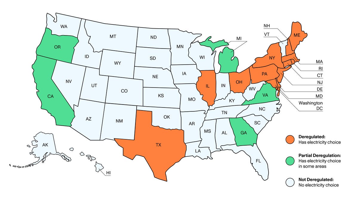In deregulated markets, companies offer a range of energy plans with competitive prices, energy source choices and terms. The intent is for competition between businesses to incentivize efficiency — if a company operates with lower overhead, it can offer lower rates and attract more business.
